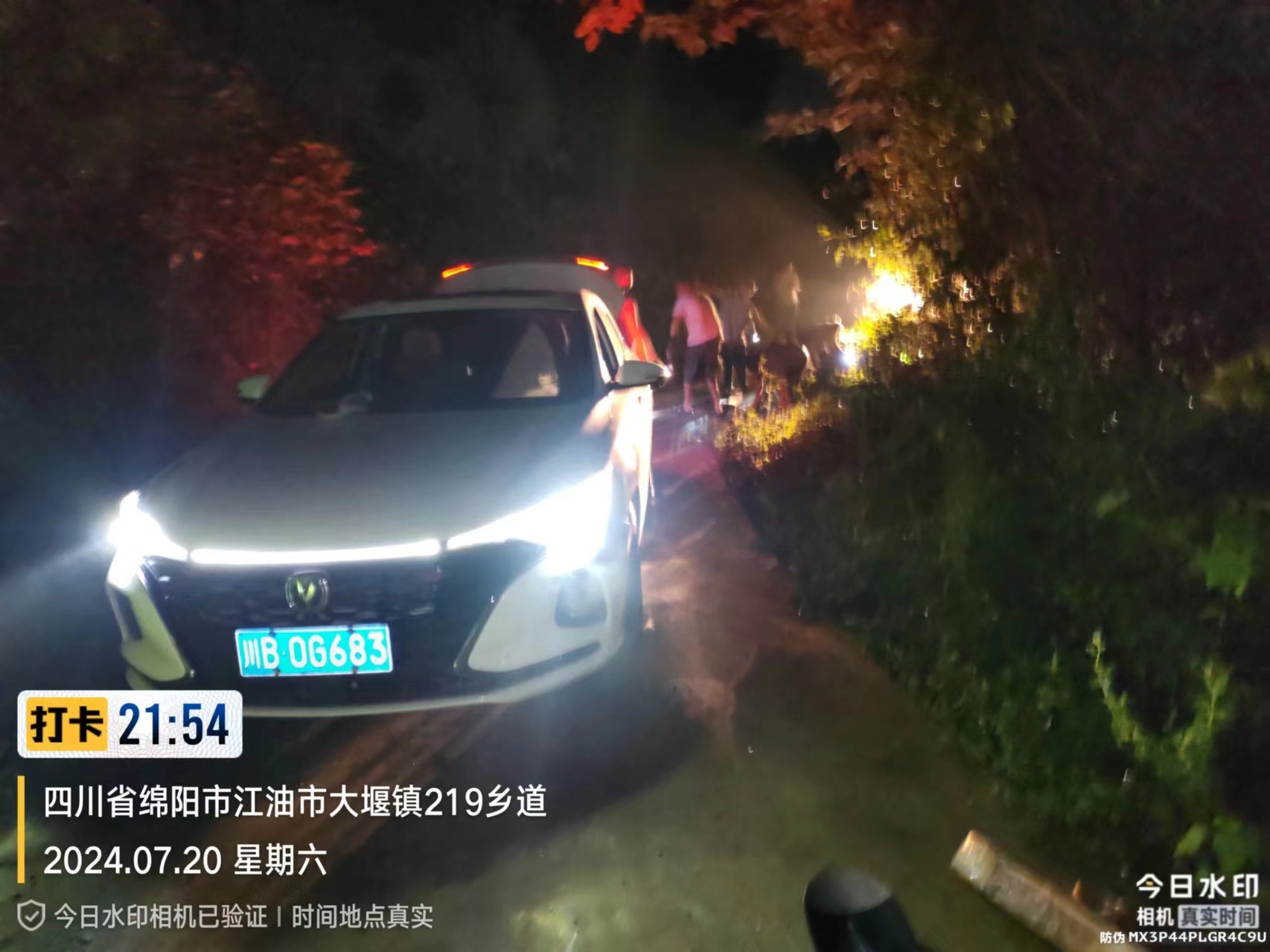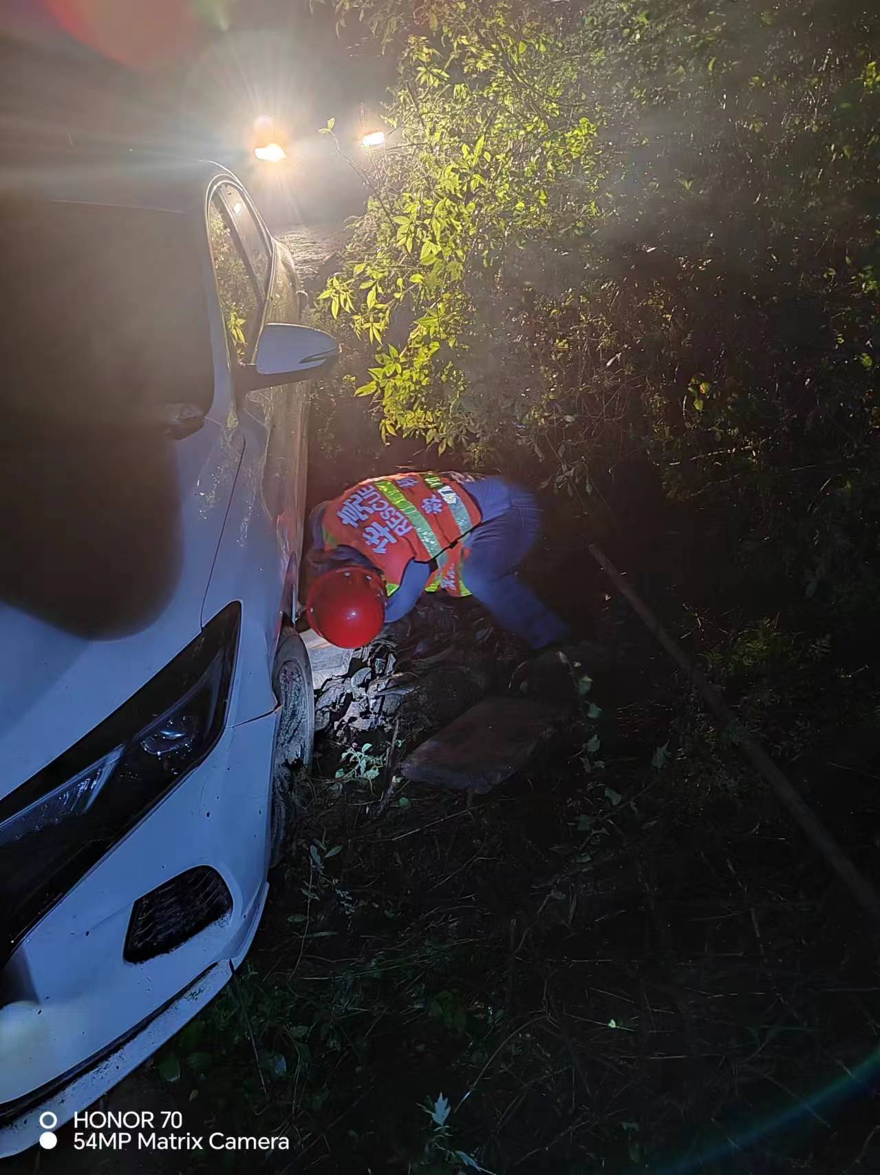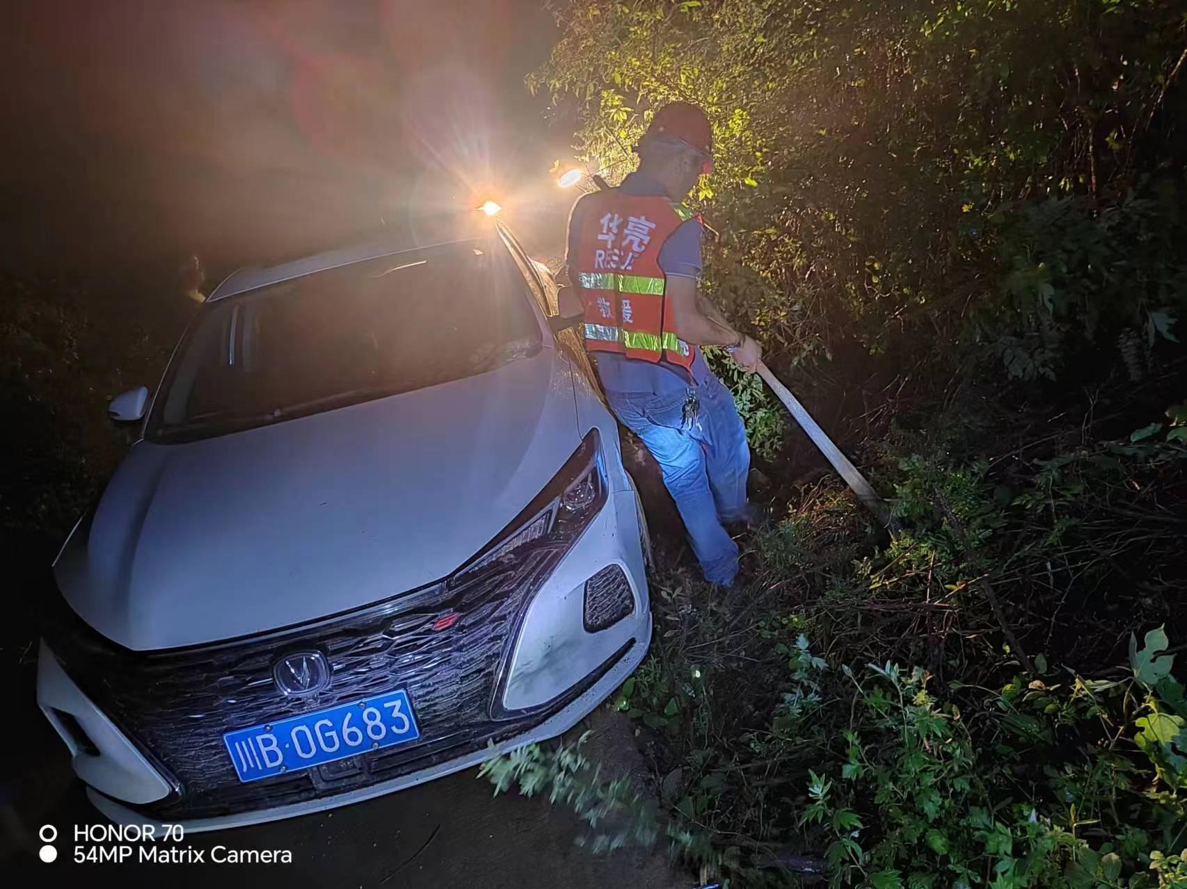2024年7月20日晚上,华亮救援接到太平洋保险公司救援电话,唐先生车辆行驶在江油市大堰镇219乡道,因路面湿滑车辆侧滑驶入路壕,请求紧急外出救援。